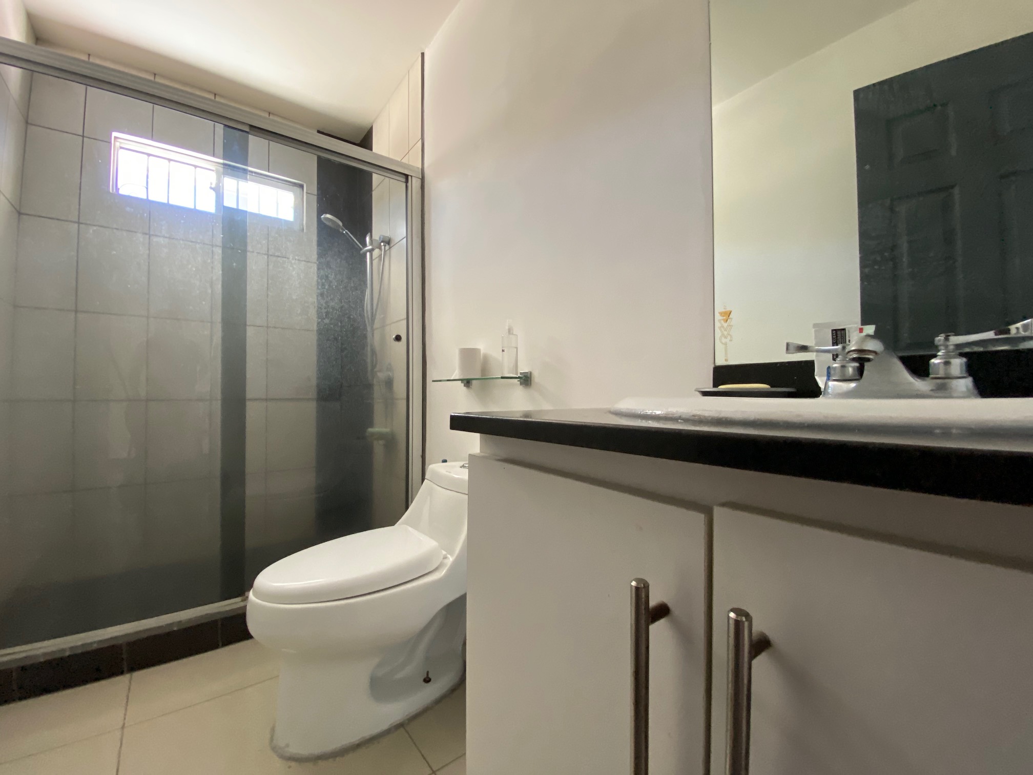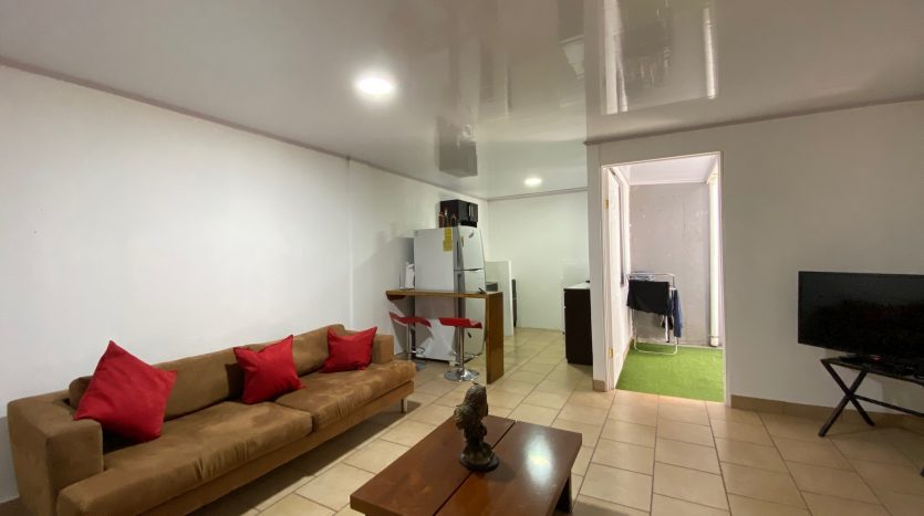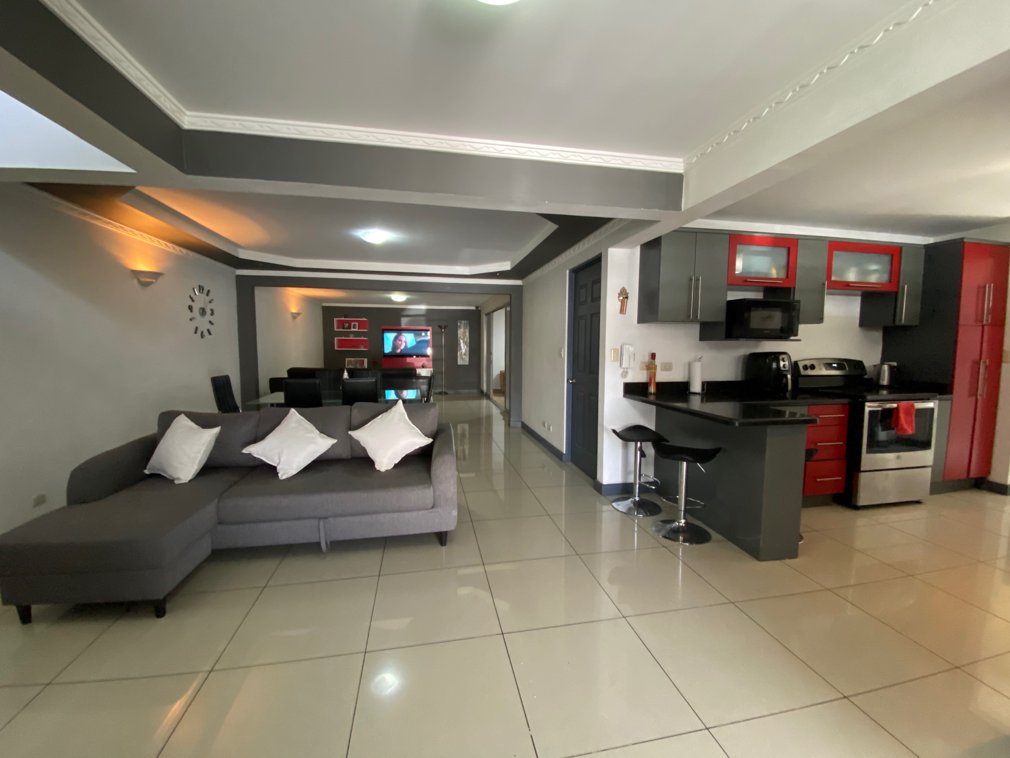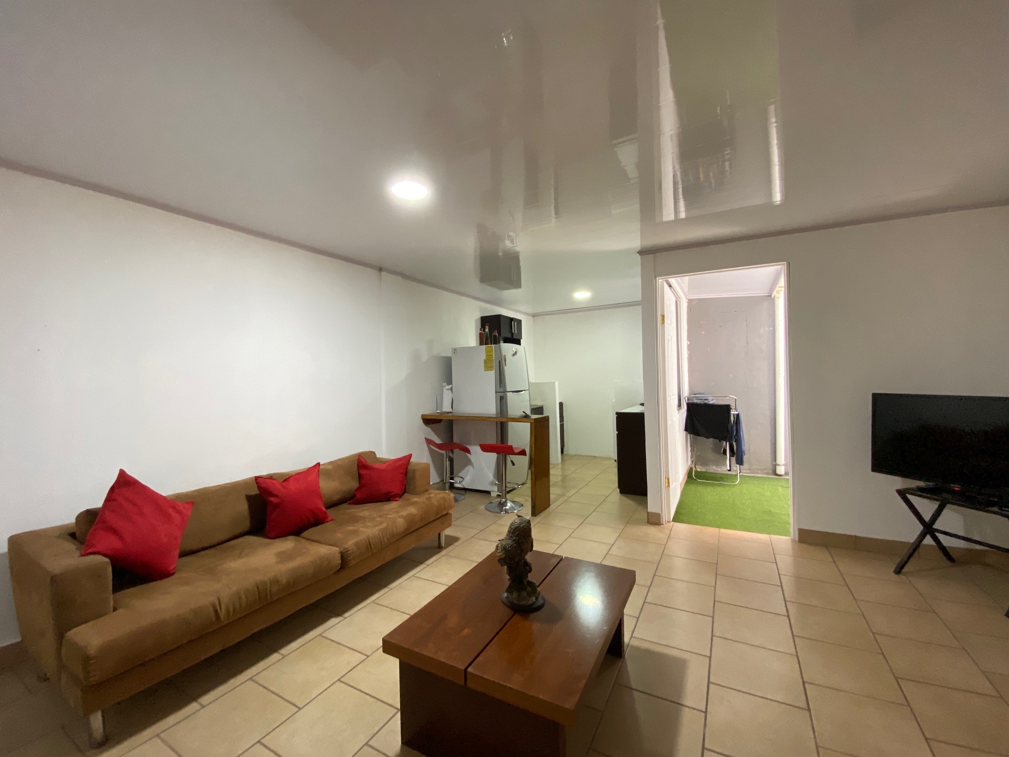 - Apartamento con espacio abierto de sala, comedor, cocina y habitación con baño completo.