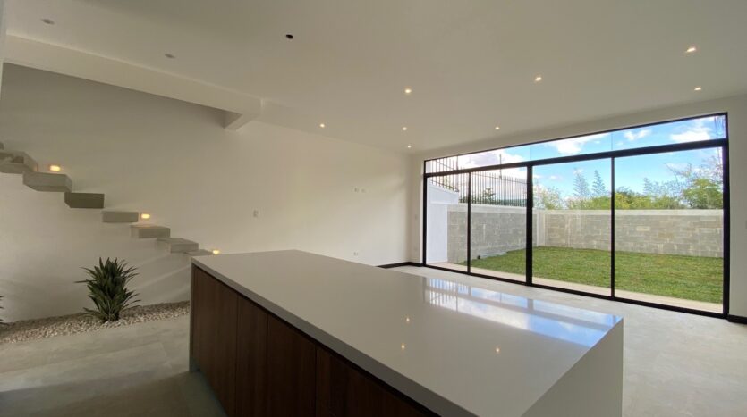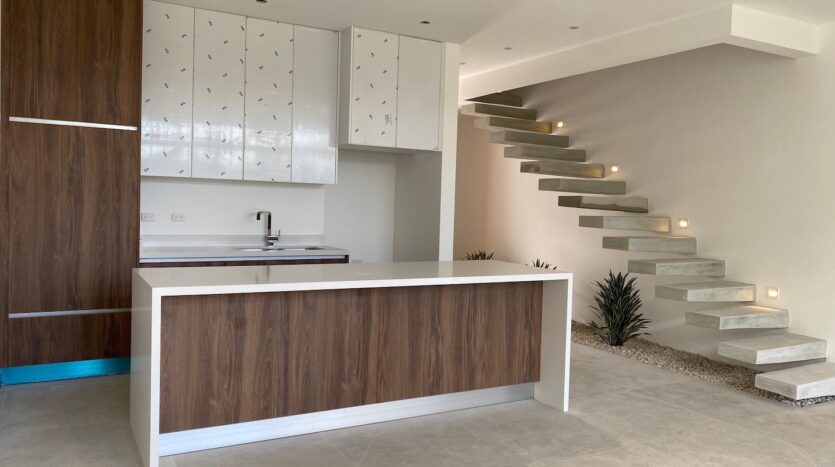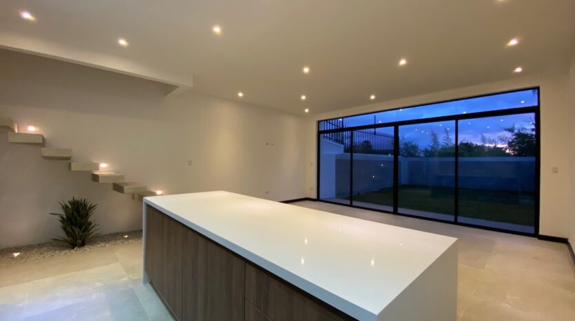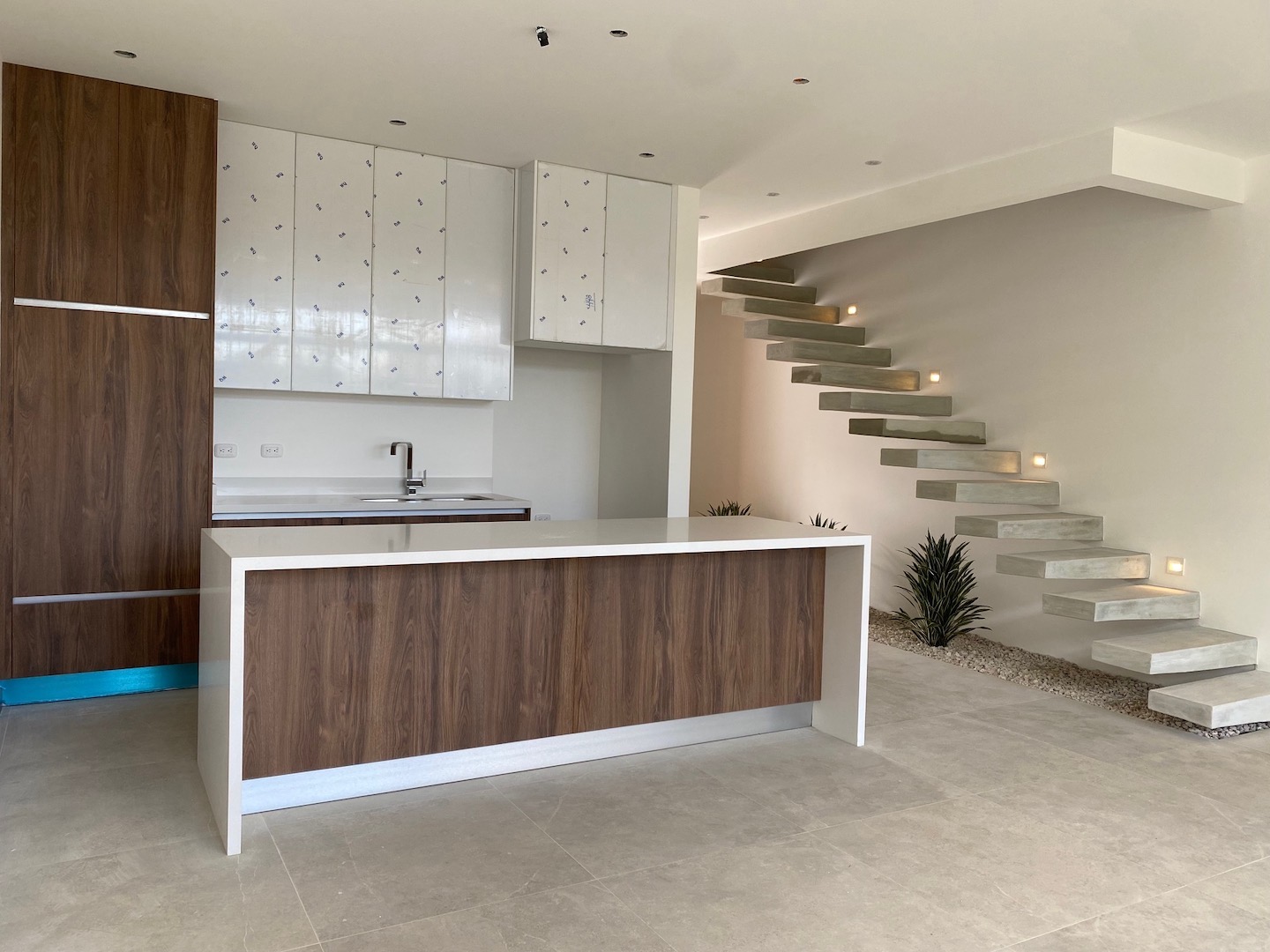 Amplia cocina con desayunador en cuarzo y doble altura parcial en espacio.