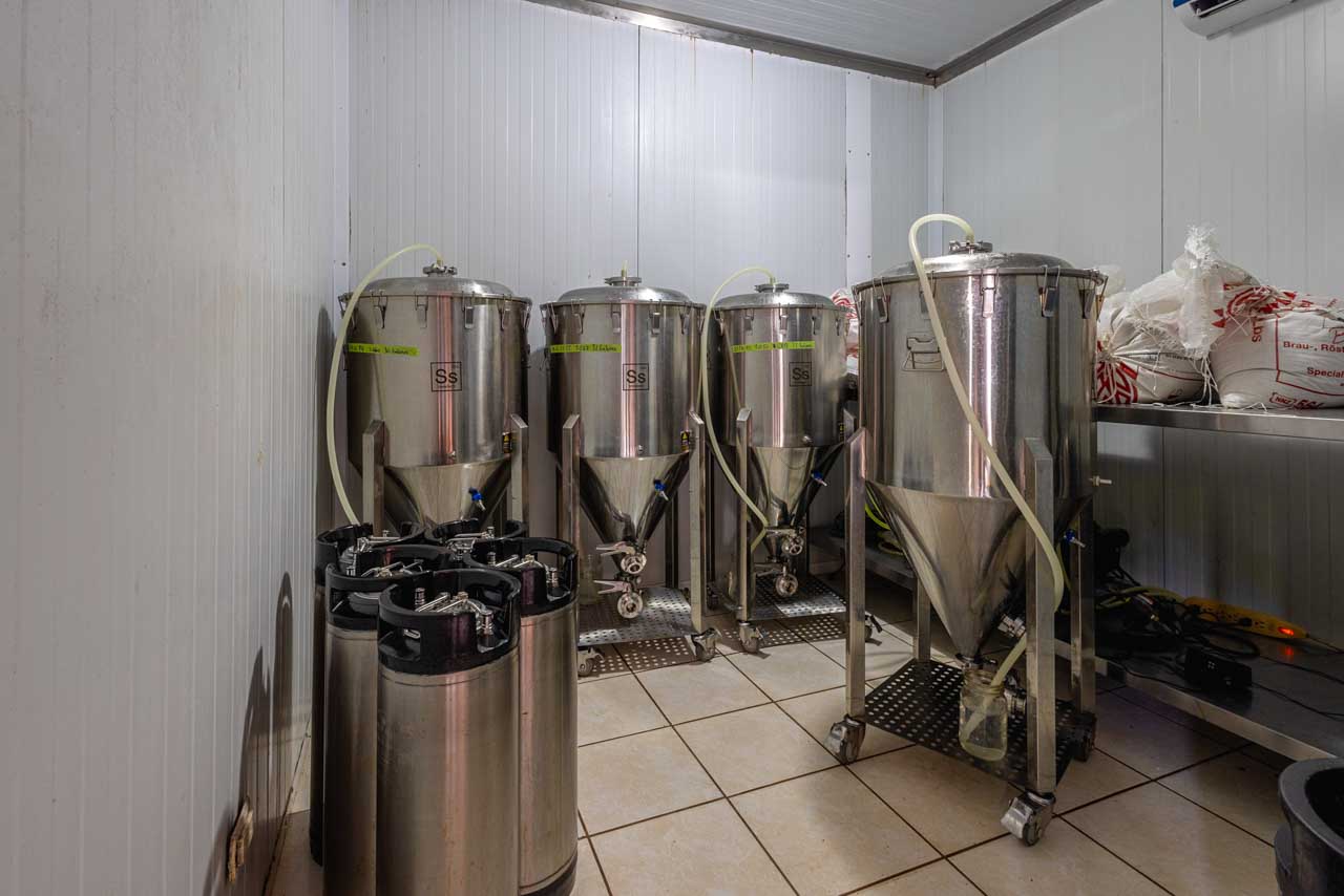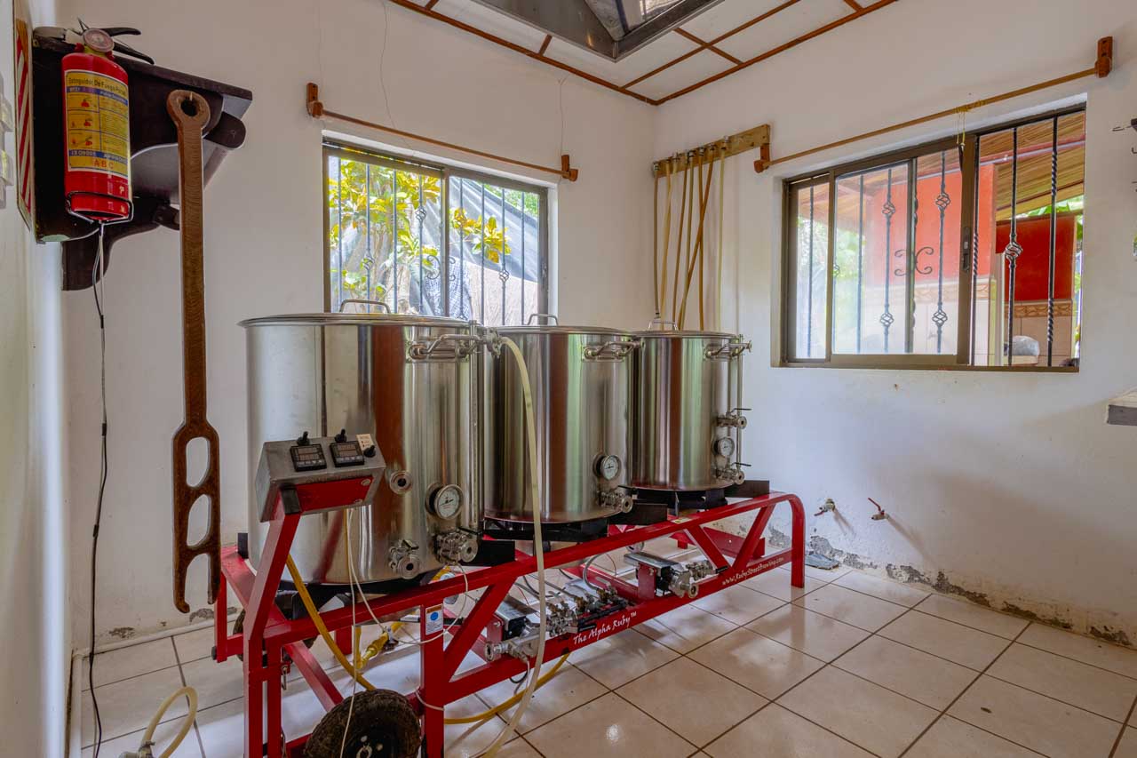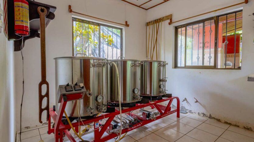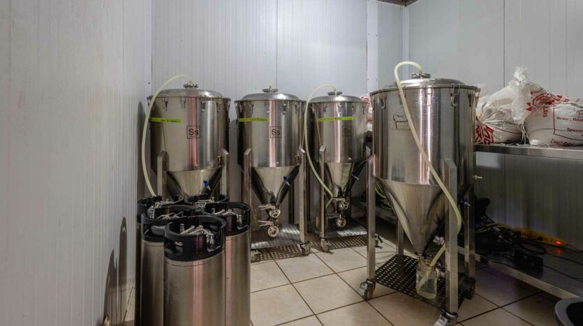 Fábrica de cerveza con sala de fermentación, cocina industrial, dos baños y área exterior con cocina y lavado de barriles.