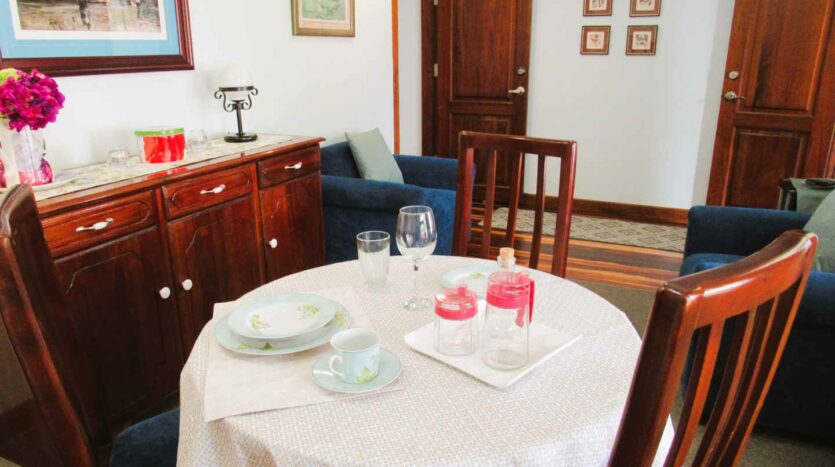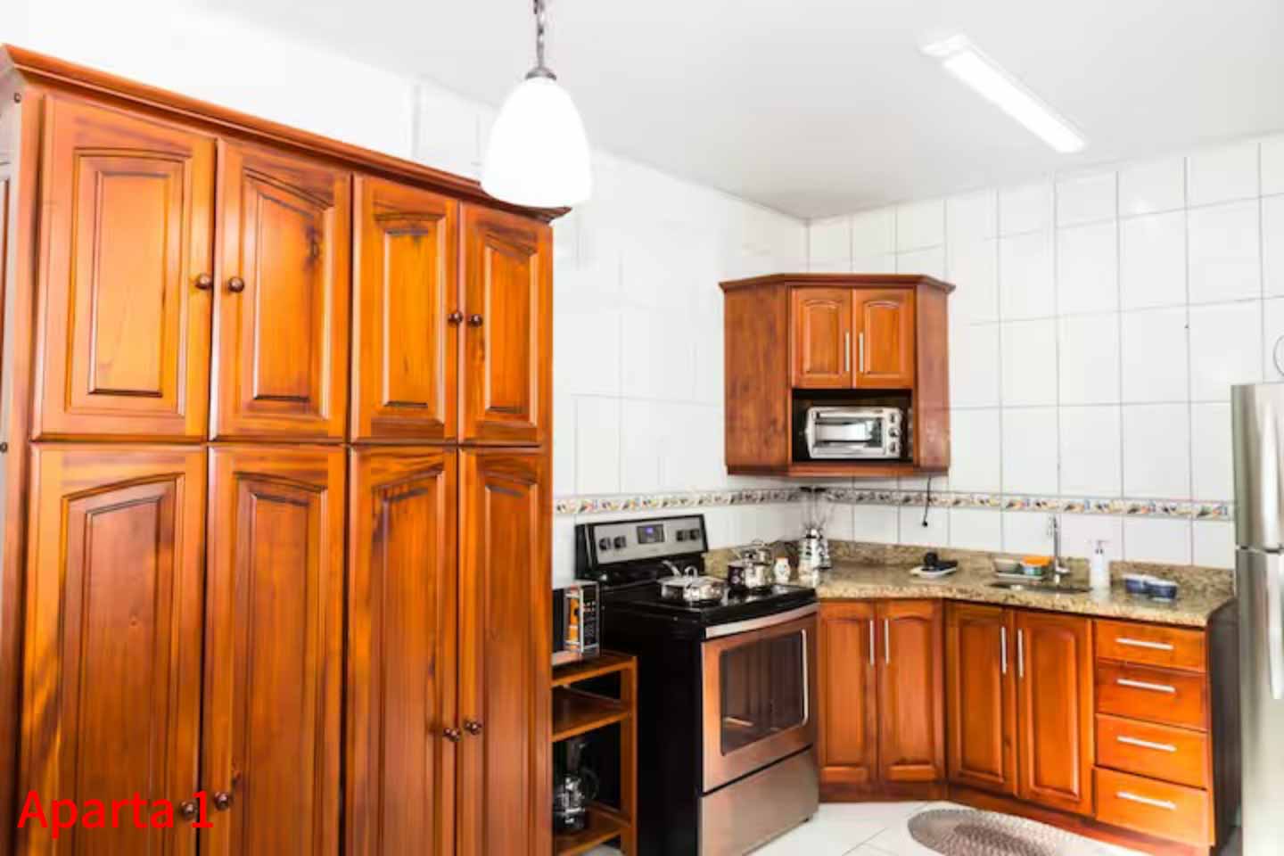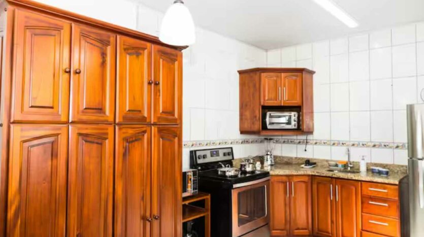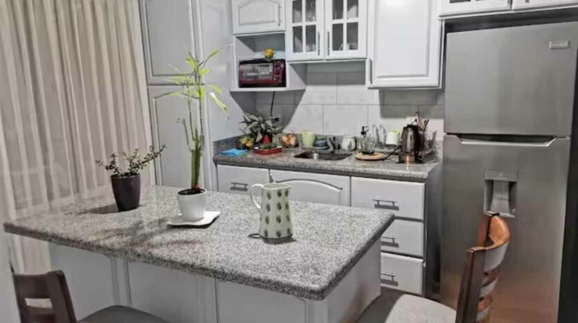 • 🍽️ Cocina con muebles de madera fina y sobre de granito.