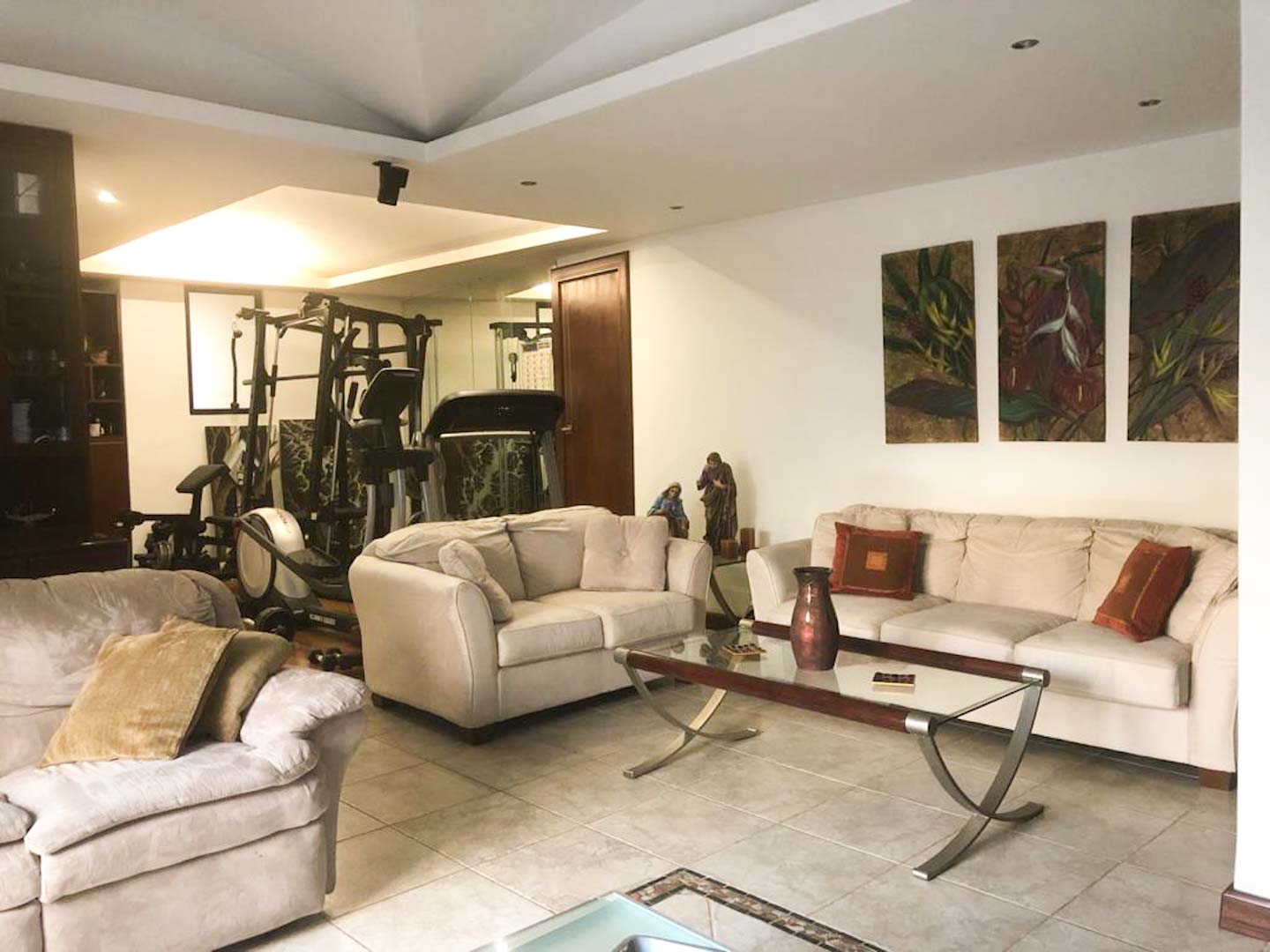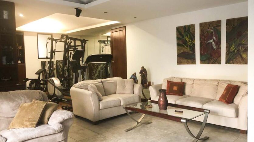 En el primer nivel cuenta con sala y cocina muy ámplias, comedor , espacio para bar, medio baño de visitas, cuarto de lavado, cuarto de servicio con baño completo, habitación para TV o bien para gimnasio, jardin trasero y terraza muy amplia para juegos, 3 bodegas, parqueo hasta para 4 carros.
