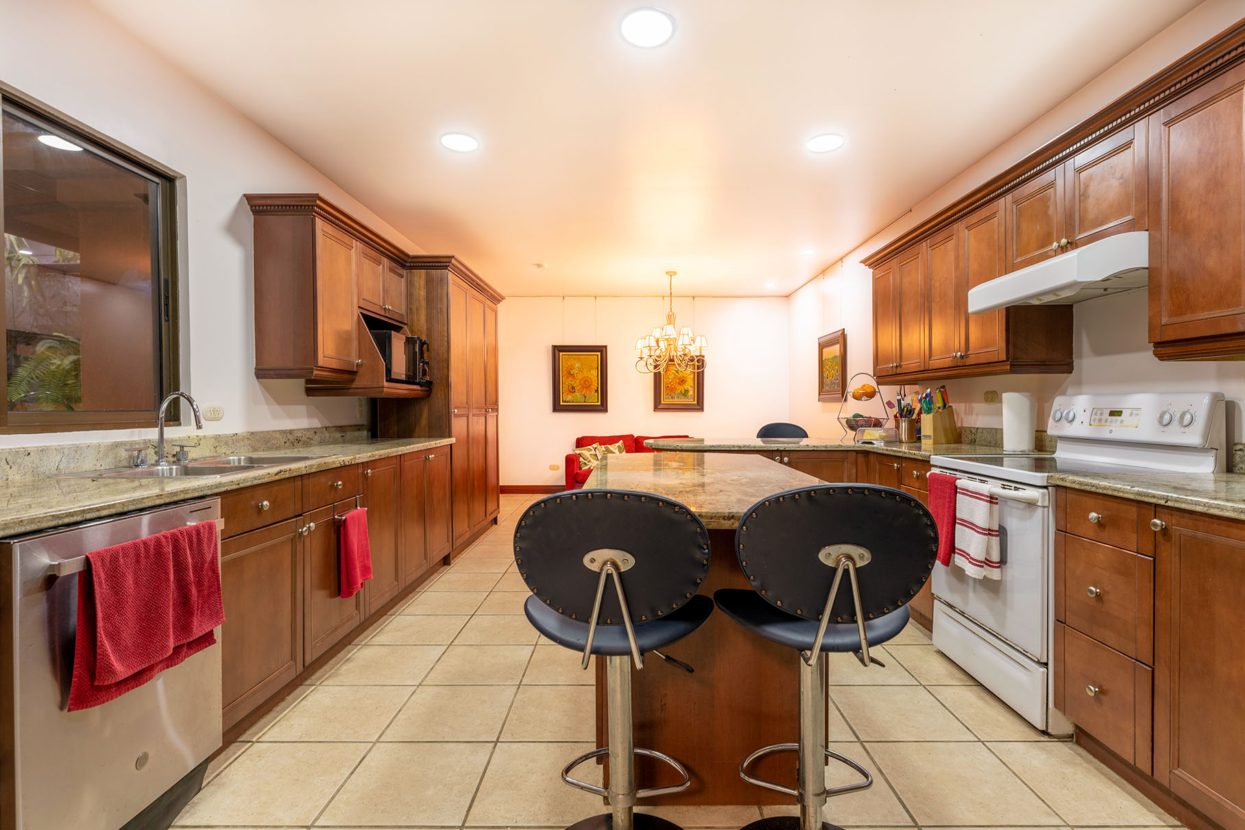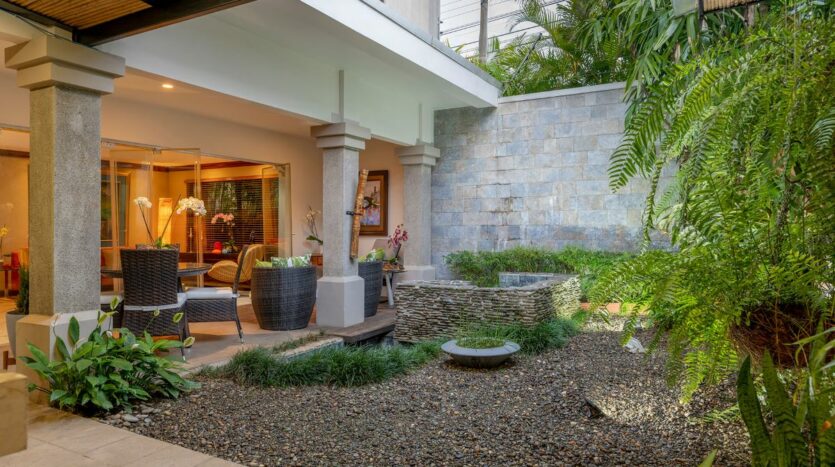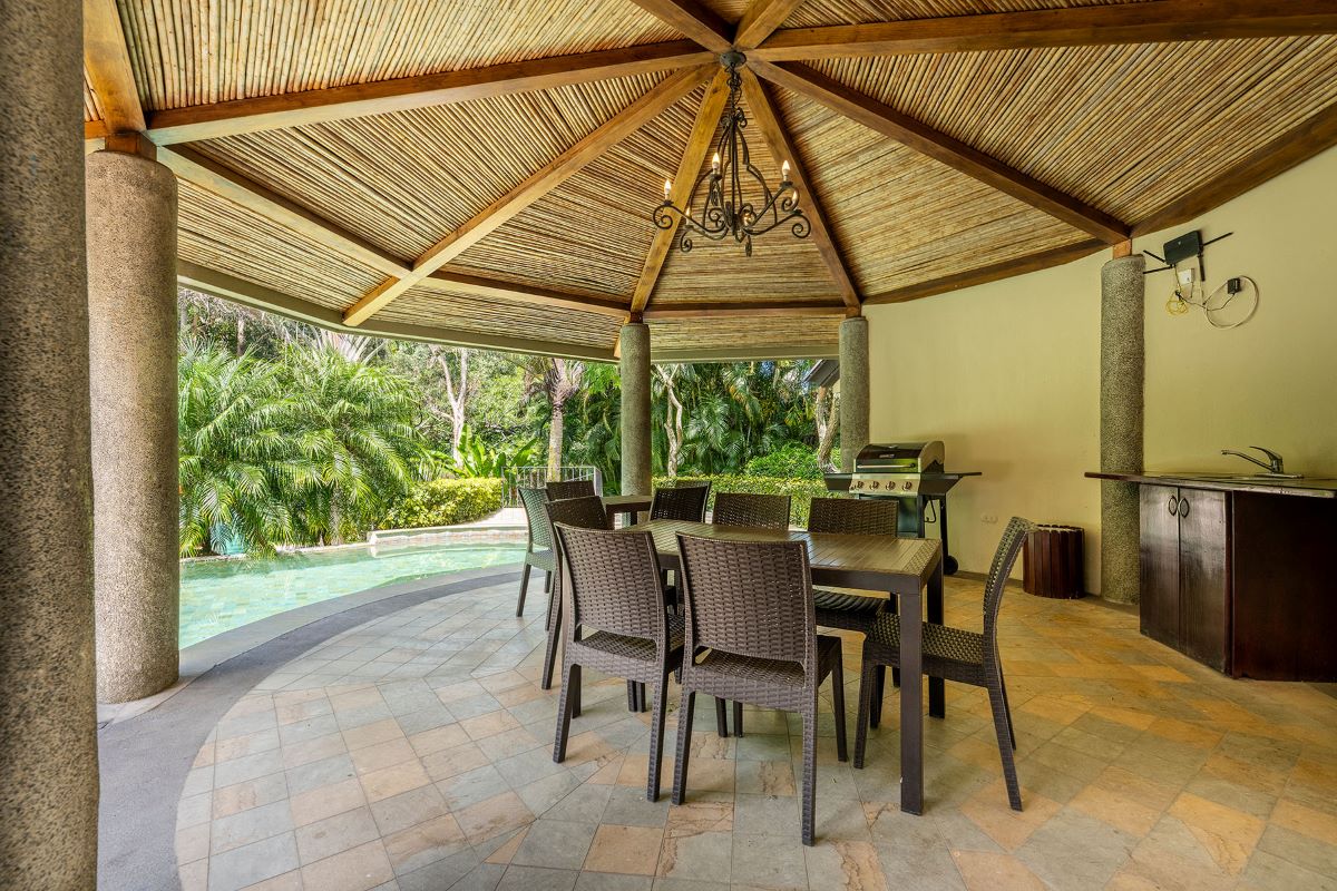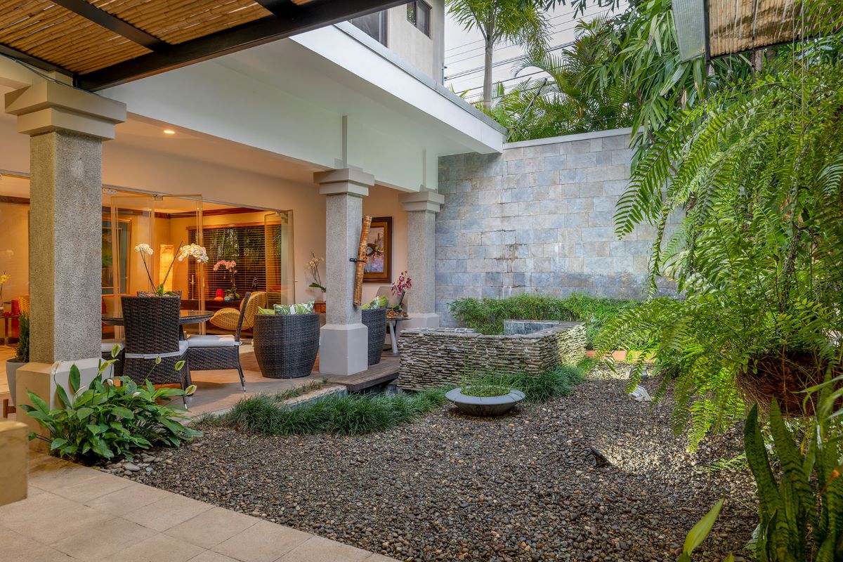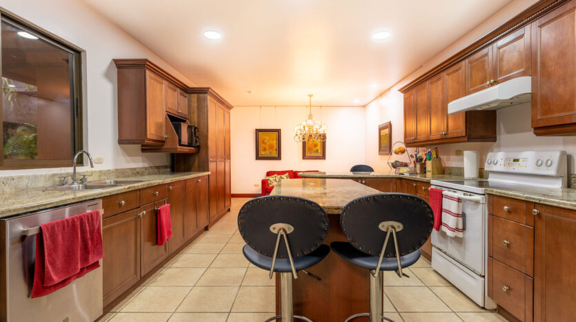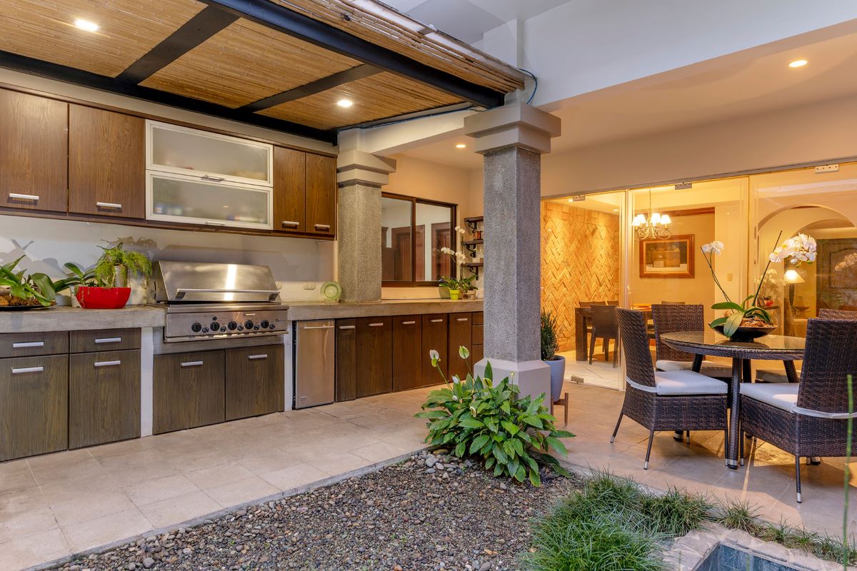 Vestíbulo, ½ baño visitas, Áreas sociales amplias (sala, comedor), Terraza con BBQ y un Jardín interno con fuente y muy bien decorado, además Cocina amplia con desayunador e isla, mostrador de granito y alacena, un área de antecomedor, lavandería con bodega, Dormitorio y baño de servicio y con parqueo para tres carros.