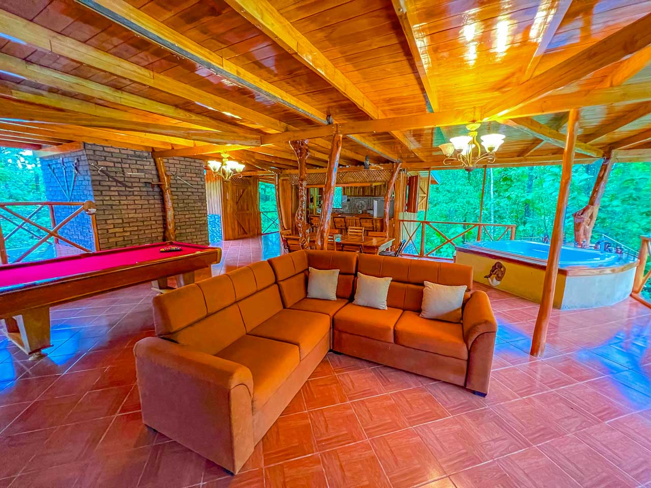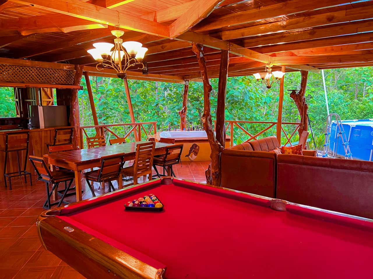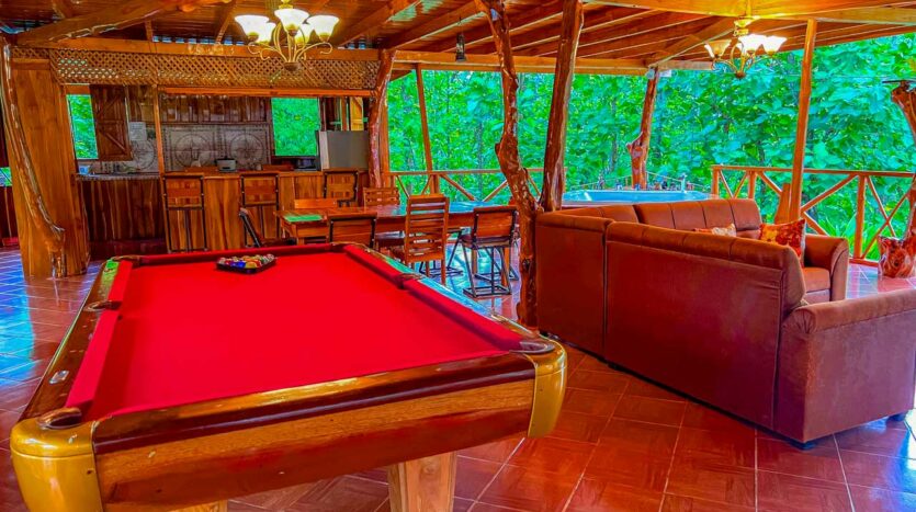 The main house is light-filled and airy 🌞, built with natural wood and designed for open, relaxed living. Downstairs, a comfortable living area 🛋️ and fully equipped kitchen 🍽️ lead out to your private paradise: a swimming pool, jacuzzi, and even a poolside billiards table 🎱, surrounded by lush gardens that invite you to slow down and enjoy.
