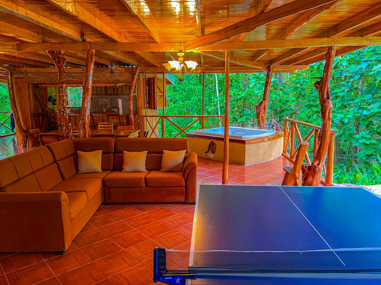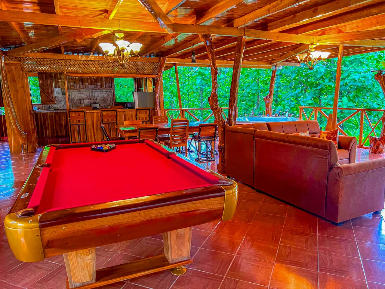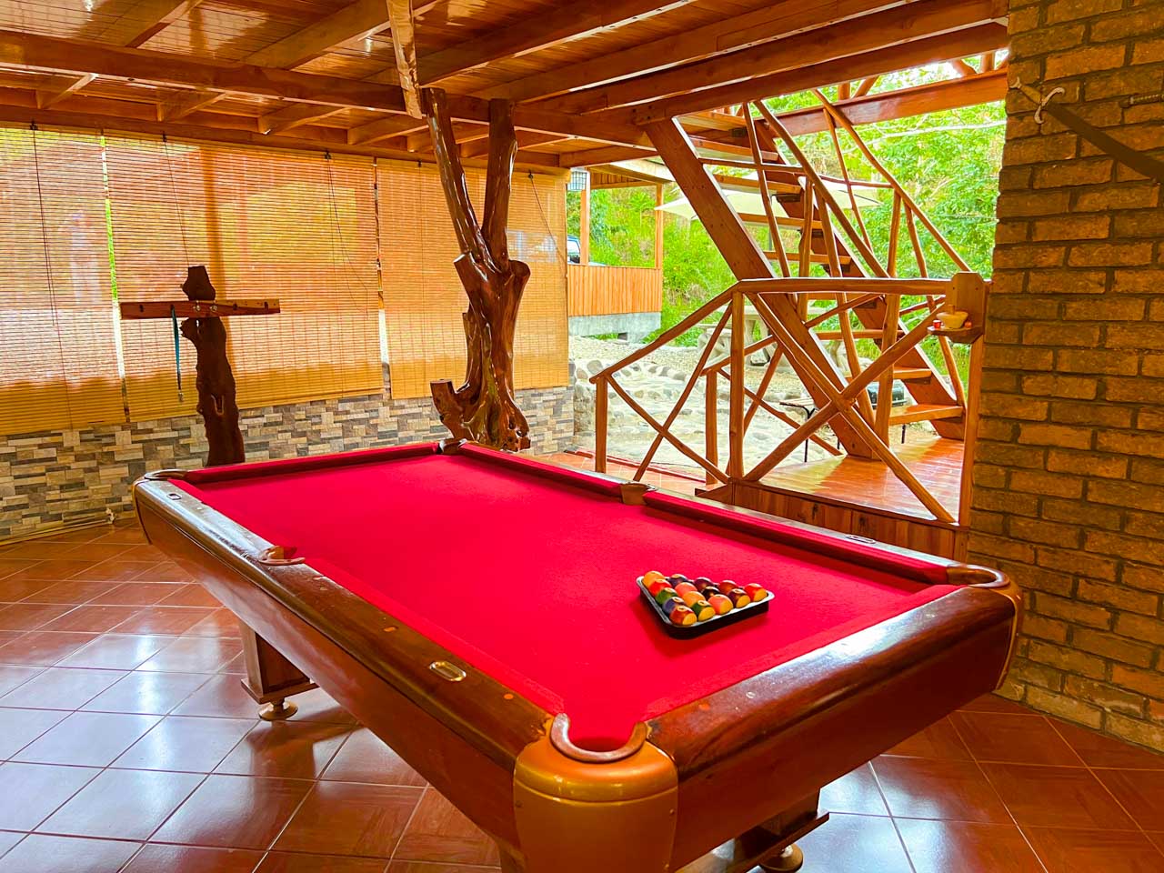 The main house is light-filled and airy 🌞, built with natural wood and designed for open, relaxed living. Downstairs, a comfortable living area 🛋️ and fully equipped kitchen 🍽️ lead out to your private paradise: a swimming pool, jacuzzi, and even a poolside billiards table 🎱, surrounded by lush gardens that invite you to slow down and enjoy.