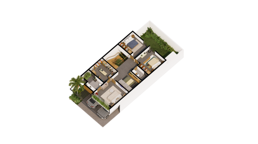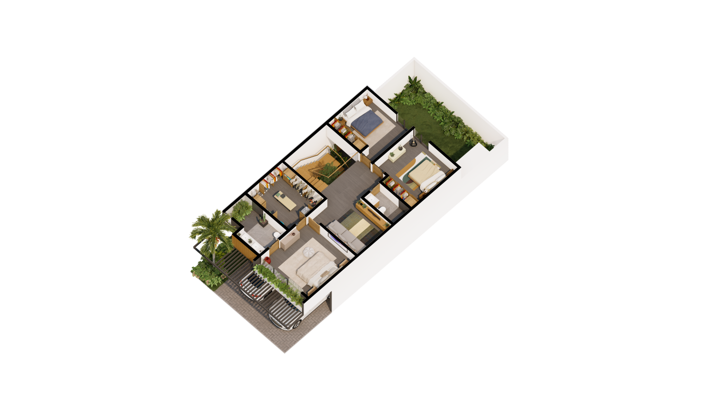 - Características: Incluye cuarto de servicio. Elimina el jardín interno de las gradas. 3 habitaciones amplias, garaje para 2 o 3 vehículos, 3.5 baños, área de lavado en el patio.
