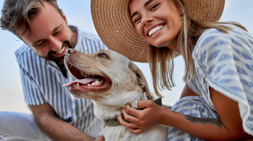A cute woman in a dress and a straw hat and a handsome man in a striped shirt with their labrador dog are having fun on the seashore.